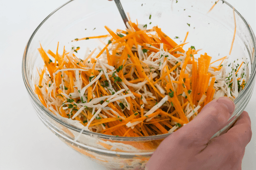 Cut the cabbage and carrot into thin strips, chop the parsley.
