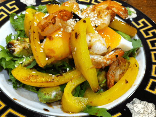 Hot salad with arugula, shrimp and avocado