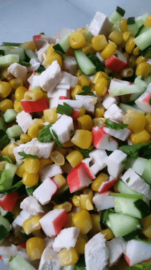 Cut crab sticks, cucumbers, and chicken breast into cubes, add corn, salt, mix everything with mayonnaise.