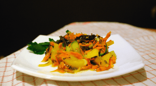 This seaweed salad with a spicy mustard, garlic, and ginger dressing offers the perfect blend of freshness and aromatic spice. Seaweed, popular in Eastern and European cuisines, is rich in iodine and beneficial trace elements, while its delicate texture pairs excellently with crunchy carrots, sweet peppers, and fresh cucumbers. The dressing made from olive oil, wine vinegar, fragrant coriander, and black pepper adds complexity to the dish with a hint of spiciness. This salad is great as a standalone dish or as a side to fish or seafood. It refreshes, satisfies and benefits health, making the meal not only tasty but also nutritious.