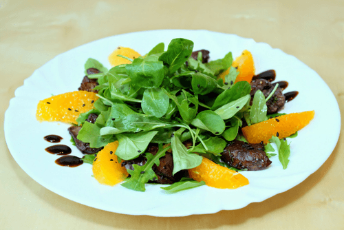 Warm chicken liver salad with orange is a refined dish of European cuisine that combines the tenderness of liver with refreshing citrus acidity. The recipe's origins trace back to the gastronomic traditions of France and Italy, where complex flavor combinations are valued. The golden-brown fried chicken liver takes on a caramelized hue thanks to honey and balsamic vinegar, while juicy orange segments add brightness. An orange juice-based dressing highlights the freshness of the ingredients. The dish has a rich flavor with a balance of sweet and savory notes. The salad is served immediately after preparation to retain the warmth of the liver and the freshness of the greens, while sesame seeds add a light nutty texture. Ideal for special dinners or as an elegant dish for gourmets.