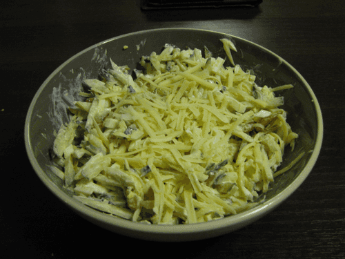 Mix cucumbers, eggs, shrimp, and sauce. Sprinkle grated cheese on top.