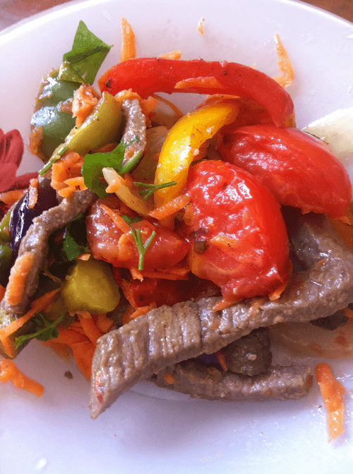 Cut the meat into strips (about 1.5x10cm), cook in a pan until done, add salt to taste. Five minutes before it's done, squeeze half a lemon into the meat and add chopped garlic.