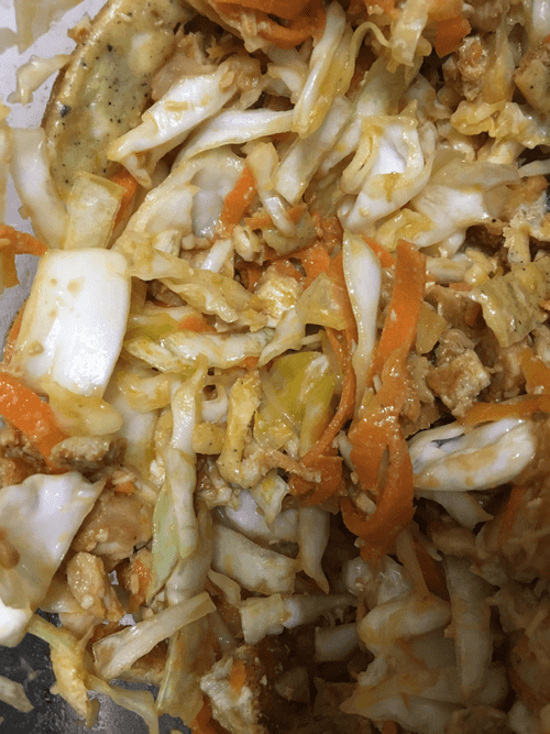 Cut the chicken fillet into strips, fry in vegetable oil until golden brown, add garlic (chopped), onion (sliced into half rings), add ketchup, soy sauce or water to taste - simmer until cooked. Once cooled, add to cabbage.