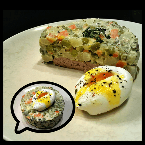 Place a meat patty on a plate, set a mold on top, carefully layer the Olivier salad, smooth it out, remove the mold, and garnish with a poached egg.