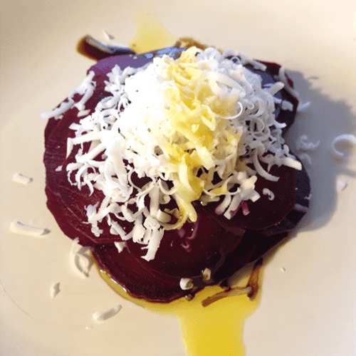 Layered beet salad with hard goat cheese