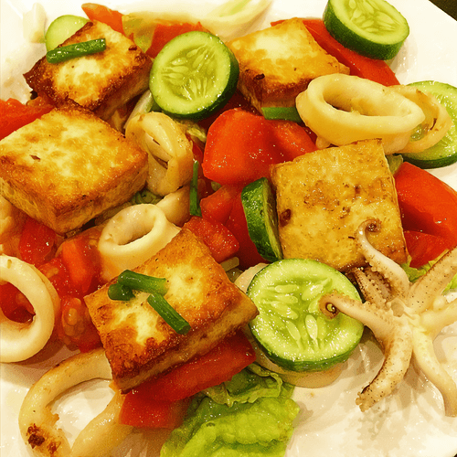 Warm salad with squid and tofu is an exquisite blend of seafood and plant ingredients, creating a harmony of taste and texture. Tender squid, lightly fried to softness, combines with crunchy vegetables and golden tofu that absorbs the aroma of spicy chili pepper. This salad is a great dish for a light dinner or stylish treat. Its roots can be found in European cuisine, where simple yet refined combinations of ingredients are valued. The spiciness of soy sauce adds depth to the dish, while green onions provide freshness. Perfect as a standalone dish or an accompaniment to the main meal, delighting with its tenderness and rich shades.