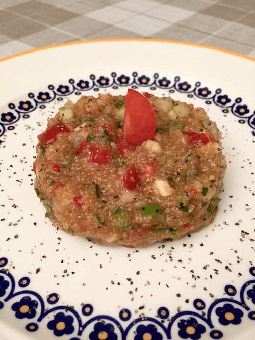 Quinoa salad with fresh vegetables is a light and nutritious dish that embodies a harmony of flavors and health benefits. Quinoa, an ancient grain of the Incas, gives the salad a delicate texture and a slight nutty flavor, while fresh vegetables like bell pepper, fennel, celery, and tomatoes add juiciness and vibrant colors. The dressing made from soy sauce, lemon juice, and sesame oil adds an Eastern touch, enriching the taste with umami and a hint of acidity. This salad is perfect as a standalone dish or a healthy side that complements fish and meat dishes beautifully. It fits well into the modern healthy eating regimen, providing a sense of freshness and energy.