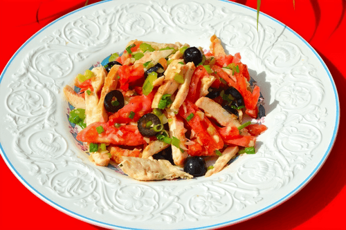 Chicken salad with olives and tomatoes is a vibrant and balanced dish of European cuisine that combines the freshness of vegetables, the tenderness of chicken meat, and the spiciness of olives. This salad originated from the desire to create a light yet nutritious dish suitable for both everyday meals and festive occasions. The taste of this salad is harmonious: the acidity of wine vinegar highlights the sweetness of tomatoes, while garlic and black pepper add a spicy depth. Dressed with olive oil, the salad gains a rich aroma and velvety texture. It pairs well with crispy bread or can serve as a standalone light dinner. Due to its simplicity in preparation and natural ingredients, this salad is perfect for those who appreciate healthy and delicious food.