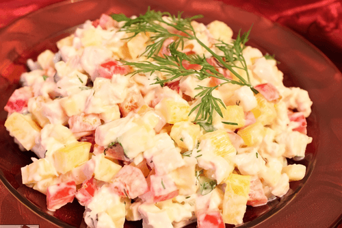 'Gentle Salad for Ladies' is a refined combination of light and juicy ingredients created for those who appreciate exquisite taste. The chicken fillet base adds tenderness to the dish, while sweet pepper and pineapple contribute freshness and a light sweet-sour note. Mushrooms sautéed to a golden crust bring a subtle mushroom aroma to the salad, and chicken eggs add softness and richness. Dressed with sour cream, this salad maintains its lightness while remaining rich and harmonious. It can be served as a classic mixed dish or layered to emphasize the texture of each ingredient. This salad is perfect for a light dinner or festive table where delicate flavor nuances and freshness balance are valued.