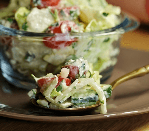 Fresh vegetable salad with cheese-mustard dressing is the embodiment of simplicity and flavor in European cuisine. It features tender lettuce leaves, crunchy cucumbers, and juicy cherry tomatoes, complemented by spicy onion and fresh herbs. The highlight of the dish is its dressing, where the sharpness of mustard harmonizes with the creamy softness of sour cream and the rich aroma of parmesan. This combination makes the salad both light and rich. It is perfect as a refreshing side to main dishes or as a standalone snack. The recipe's roots can be found in Mediterranean culinary traditions, where fresh vegetables and aromatic dressings play a key role. This salad will be a bright decoration for any table, offering freshness and richness of flavor to everyone who tries it.