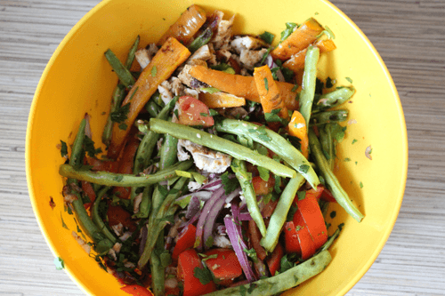 Warm salad with chicken and grilled vegetables is a harmonious blend of juicy chicken, aromatic vegetables, and fresh herbs combined with a light spicy dressing. This recipe is inspired by European cuisine, where simplicity and natural flavors play a key role. Chicken breast infused with oregano and olive oil takes on an appetizing golden hue on the grill, while beans and carrots retain their light crunchiness and rich flavor. The addition of red onion and tomatoes adds juiciness and pleasant freshness to the dish. The lemon-mustard dressing highlights all the flavor nuances, making the salad refined yet light. It’s the perfect dish for warm evenings or cozy gatherings when you want to enjoy natural ingredients without excess heaviness.