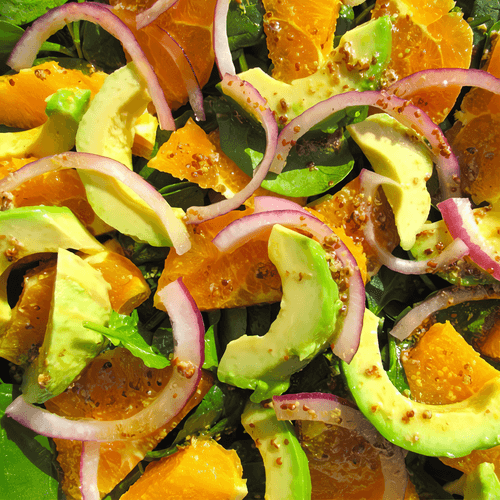 Mix avocado, oranges, and onion sliced into rings with any salad leaves you like. Serve with dressing. Bon appetit!!