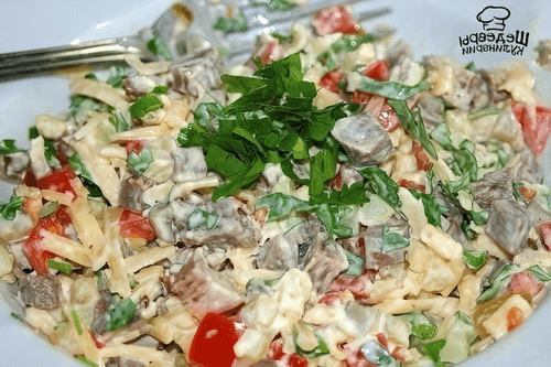 Cut everything into cubes and layer: beef, potatoes, salt, pepper, mayonnaise, cucumbers, cheese, mayonnaise, tomatoes, salt, pepper, mayonnaise, a bit of cheese and chopped parsley.