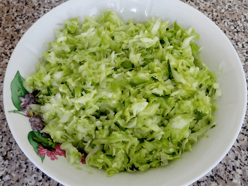 Finely chop the cabbage, place it in a wide pot, add vinegar, salt it, and heat while stirring until it wilts and turns a matte color.