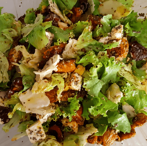 Tear the lettuce leaves and place them in a bowl. Add turkey, chia seeds, and gently mix. Sprinkle with feta cheese, cherries, lemon pieces, and dress with olive oil. Garnish with basil leaves and serve immediately while the turkey is still warm.
