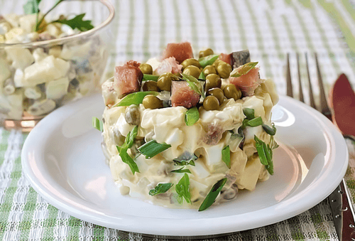 Smoked mackerel salad with apple is a harmony of flavors where tender fish combines with the freshness of vegetables and fruits. This dish has roots in Russian cuisine traditions, where smoked mackerel is valued for its rich aroma and soft texture. Apples add a light tanginess, while canned peas contribute a touch of sweetness. Cucumbers bring crunchiness, and eggs add richness. Mayonnaise unites all the ingredients, creating a balanced and nutritious dish. This salad would be a great addition to a festive table or a cozy home dinner.