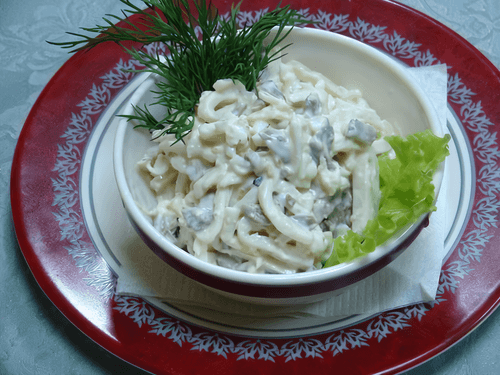 Squid salad with mushrooms is a refined dish of European cuisine that combines the tenderness of seafood with the rich flavor of fried mushrooms. Squid, known for its delicate texture, harmoniously complements aromatic champignons, spicy onions, and the freshness of pickled cucumber. Boiled eggs add softness, while mayonnaise unites all ingredients, giving the salad a creamy consistency. This dish is perfect for formal events and festive gatherings, creating a sense of sophistication. It can serve as an independent appetizer or be served with crispy toasts. This salad is an excellent choice for those who appreciate a harmonious blend of flavors and ease of preparation.