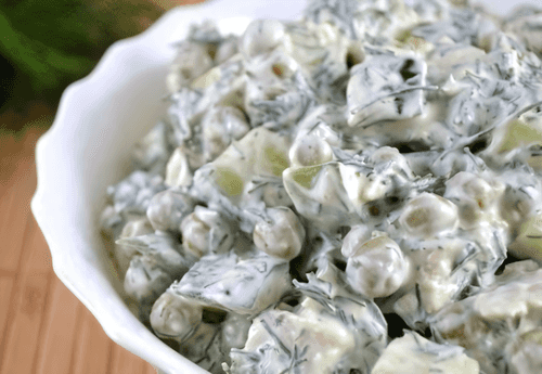 Green salad with chicken, peas and cucumbers