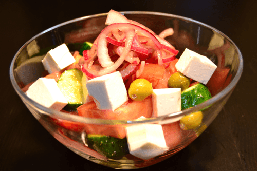 Cut two medium tomatoes and two medium cucumbers into large pieces, add olives, olive oil, season with salt, and mix. Don't add too much salt as the cheese is quite salty. Cut the cheese into 1 cm cubes.