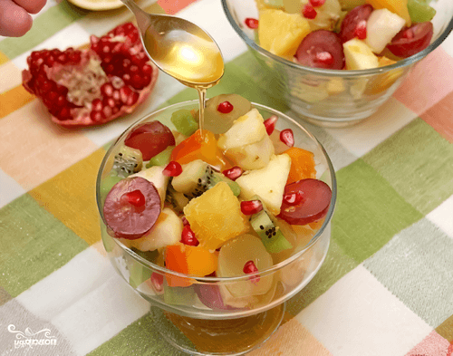 Put all the fruits in one bowl and drizzle with liquid honey. Mix gently. Distribute the fruits into dessert cups, drizzle with honey, and sprinkle with pomegranate seeds.