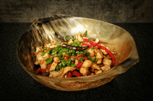 Thai chicken salad with cashews is a vibrant and aromatic dish reflecting Thailand's culinary tradition known for its skillful balance of flavors. Tender chicken fillet sautéed with garlic and onion is infused with sweet notes of honey, while oyster, soy, and fish sauces add richness and depth. Crunchy bell pepper and cashews provide textural play, while dried chili brings a mild heat. The final touch is fresh cilantro that refreshes and highlights the dish's exotic character. This salad pairs perfectly with rice or can serve as a standalone light snack filled with flavor sensations and warming eastern spices.