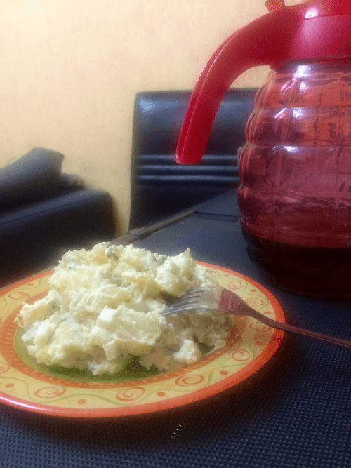Wash the potatoes well with a vegetable brush and cut them into cubes about 2 cm on each side. Place in a pot and add 3.5 liters of water. When it boils, cook for about 10 minutes. Drain the water, mix the potatoes with vinegar, salt, and pepper, and let cool for 20 minutes.