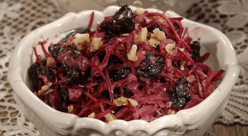 Beetroot salad with prunes is a bright and rich dish of Russian cuisine that combines the sweetness of beets, the tenderness of prunes, and the nutty crunch of walnuts. This salad has been known since Soviet times and was often served at festive tables due to its unusual taste and simplicity of preparation. Dressed with light mayonnaise, it acquires a creamy texture that perfectly complements its rich ingredients. Boiled until soft, beetroot harmoniously blends with the juiciness of prunes and the sweetness of raisins, creating a rich and layered flavor. This salad is great as a standalone dish or as a side to meat and vegetable dishes. It not only pleases the eye with its rich ruby color but also benefits the body due to its high content of vitamins and nutrients.