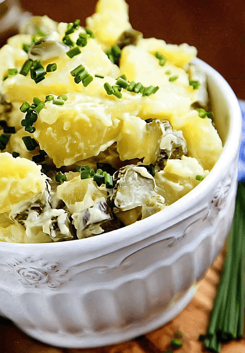 German potato salad with bacon is a traditional dish of German cuisine that combines simplicity, rich flavor, and harmony of textures. Its roots trace back to the southern regions of Germany where potato salads are often dressed with warm vinegar and mustard. Tender boiled potatoes, crispy bacon, tangy pickles, and aromatic spices create a layered taste: sour, salty, and slightly smoky. A special touch is the use of chicken broth which adds depth and richness. This salad is perfect as a side dish for meat dishes or as a standalone snack; it can be served warm or chilled. Garnished with fresh parsley, it not only looks appetizing but also embodies the warmth and traditions of German cuisine.
