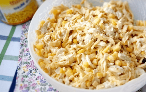 Mix the fillet, pancakes, onion, and add a little salt. Dress with mayonnaise. Add corn and mix well.