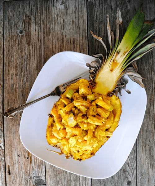 This exquisite salad of pineapple, chicken, and nuts is a gem of Pan-Asian cuisine, combining the sweetness of tropical fruit, the tenderness of chicken fillet, and the crunchy texture of nuts. The origins of such a combination trace back to Asian traditions where exotic fruits harmoniously intertwine with meat ingredients. Pineapple, filled with sunny freshness, envelops the tender chicken fillet creating a unique flavor contrast while lightly roasted nuts add a piquant touch to the dish. The mayonnaise dressing with curry adds an Eastern note and enriches the taste. Serving it in half a pineapple is not only an aesthetic gesture but also a way to emphasize the dish's freshness. This salad is perfect for both festive gatherings and light dinners with an exotic twist.