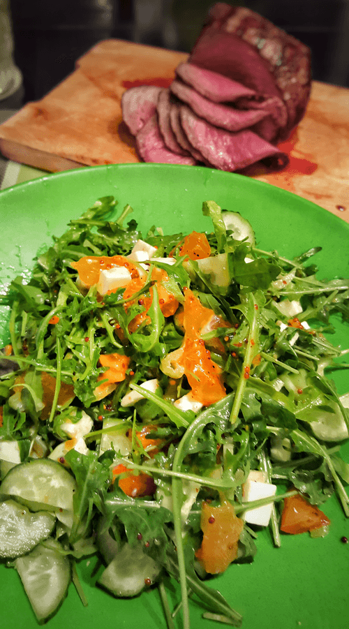 This salad is a vivid example of Greek cuisine, combining freshness, simplicity, and sophistication. Arugula adds a light spiciness to the dish, persimmon brings sweet tenderness, and feta provides a salty creaminess. Cucumbers refresh the taste, while the dressing of Dijon mustard, honey, and olive oil fills the salad with depth of flavor nuances. The dish is perfect as a light lunch or elegant appetizer. It blends traditional Greek motifs with an unexpected sweet accent. It can be served as a standalone dish or as a side to meat and fish. The salad is easy to prepare and will pleasantly surprise guests with its harmony of flavors and elegance in presentation.