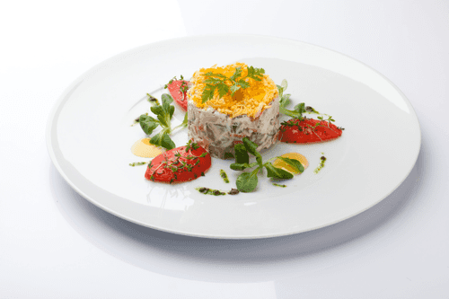 The author of this Olivier is the chef of the Moscow restaurant "Bochka" Igor Bednyakov. In "Bochka" they fry meat in a variety of ways, so the chicken in the salad is smoked, with a smoky aroma. Sun-dried tomatoes also give it some smokiness. Horseradish is added to the dressing almost right before serving, without which the Russian snack menu is unimaginable.