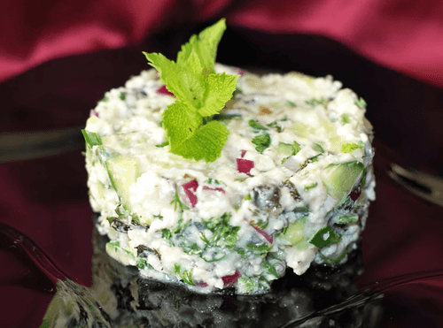 Add everything to the feta cheese and mix. Use a cooking ring or something else (if available) to shape and decorate with mint leaves.