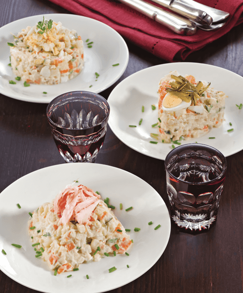 Mix crab cubes with vegetables, peas, and chopped eggs. Add finely chopped parsley, dill, and the white part of leeks. Season with salt and pepper to taste. Let it rest for about 15 minutes to allow all ingredients to release their juices.