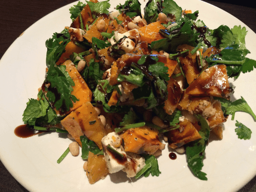 Mix pumpkin with feta cheese, ginger, and cilantro, season to taste with salt, sprinkle with nuts, and drizzle with balsamic sauce.