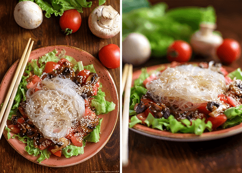 Funchosa with mushrooms and cherry tomatoes is an exquisite dish of Pan-Asian cuisine that combines lightness, rich flavors, and visual appeal. The recipe's origins trace back to Asia, where glass noodles made from starch are valued for their versatility and ability to absorb sauces. In this version, funchosa is complemented by juicy mushrooms sautéed in aromatic teriyaki sauce and sweet cherry tomatoes. Tender lettuce leaves add freshness while sesame provides a light nutty note. The dish is perfect for a light dinner or festive table and can be served warm or cold. Funchosa absorbs the rich flavors of the ingredients, creating a harmonious blend of sweet, salty, and umami. The simplicity of preparation makes this recipe accessible even for novice cooks while its exquisite taste delights fans of Asian gastronomy.