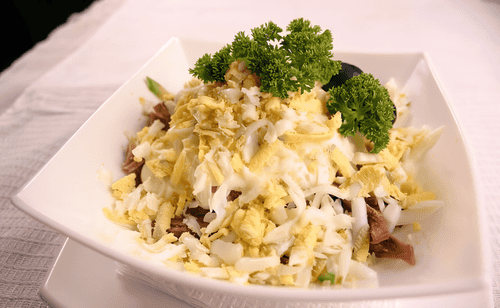 The 'Men's Caprice' salad is a hearty and rich combination of flavors created for true gourmets. This recipe combines tender boiled meat, beef tongue, and chicken eggs, complemented by the aroma of sautéed mushrooms and the spiciness of pickled onions. Grated cheese adds creaminess, while mayonnaise enhances the flavor even more. This dish is perfect for a festive table due to its nutritional value and richness. It is believed that the name relates to its intense and deep flavor that meets demanding preferences. The salad can be served as a standalone dish or as an accompaniment to the main meat course. Parsley adds freshness and completes the composition, turning the salad into a true decoration of the feast.
