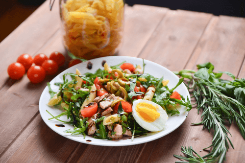 Chop the basil leaves finely and mix all the ingredients in a deep bowl, seasoning with balsamic vinegar and garnishing with halved eggs.