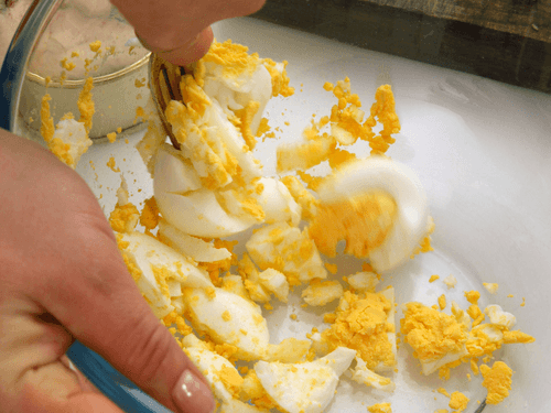 Mash the liver and eggs with a fork as finely as possible.
