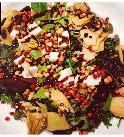 Mix salad with artichokes, feta, capers (5-6 pieces max), and pear on top. Sprinkle everything with sweet pink peppercorns, salt with pink salt (or just ground sea salt), and pine nuts.