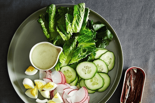 We mix the vegetables, onion, and cottage cheese sauce with herbs, then top with sliced egg.