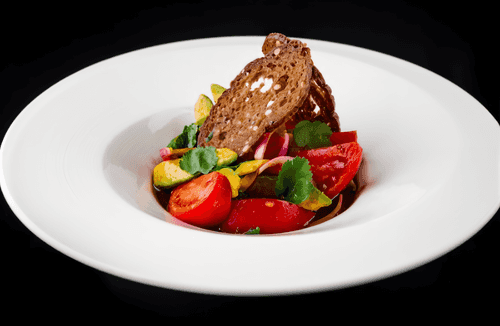 This salad with pink tomatoes and avocado is a true embodiment of simplicity and sophistication in European cuisine. The combination of juicy sweet pink tomatoes with the creamy texture of avocado creates a harmony of flavors, complemented by the light spiciness of red onion. Croutons from French baguette add a crunchy note, while aromatic cilantro finishes the composition with freshness. Dressed with an exquisite duo of olive oil and balsamic sauce, this salad is the perfect addition to a light dinner or summer lunch. It not only delights the palate but also benefits health by enriching the body with vitamins and healthy fats. Simple to prepare yet elegant in presentation—this salad captivates from the first bite.