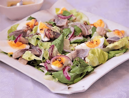 Green salad with herring and mustard dressing