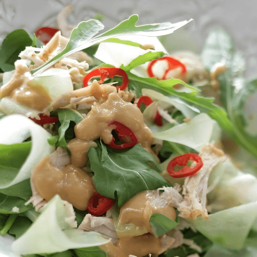 This salad with turkey, herbs, and peanut sauce offers a harmonious blend of fresh greens, spicy notes, and nutty flavors. Its roots lie in European cuisine but exotic accents give it a unique character. The turkey fillet roasted in aromatic spices is tender and juicy, while the lightness of arugula and freshness of cucumbers perfectly complement the dish. The rich peanut sauce adds depth and a slight spiciness thanks to chili pepper. This salad is ideal for both a light lunch and an elegant dinner, delighting with its exquisite taste and refined combination of ingredients.