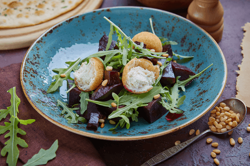 Beetroot with soft cheese is an elegant and refined dish of Italian cuisine, combining the sweet softness of beetroot, the crunchy texture of fried cheese, and the delicate aftertaste of pine nuts. This combination of ingredients creates a harmony of flavors—from the sweetness of marmalade to the spiciness of arugula. The origins of the dish can be traced back to traditional Italian appetizers where fresh natural products come together in simple yet exquisite compositions. This salad is perfect for a light dinner or festive table, allowing one to enjoy the richness of Mediterranean flavors and aromas.