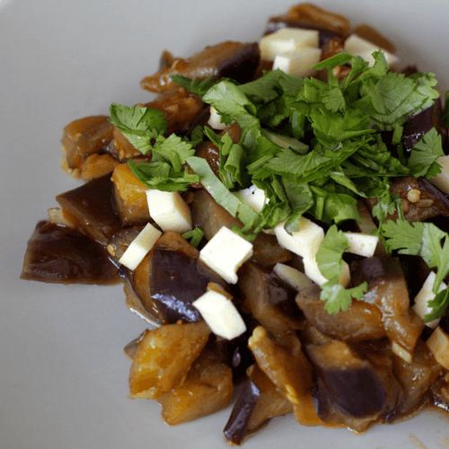 Mix the juice of half a lemon with soy sauce. Place the eggplants in a bowl, add the dressing, chopped cilantro, almonds, and crumble goat cheese on top (can be replaced with any brined cheese).