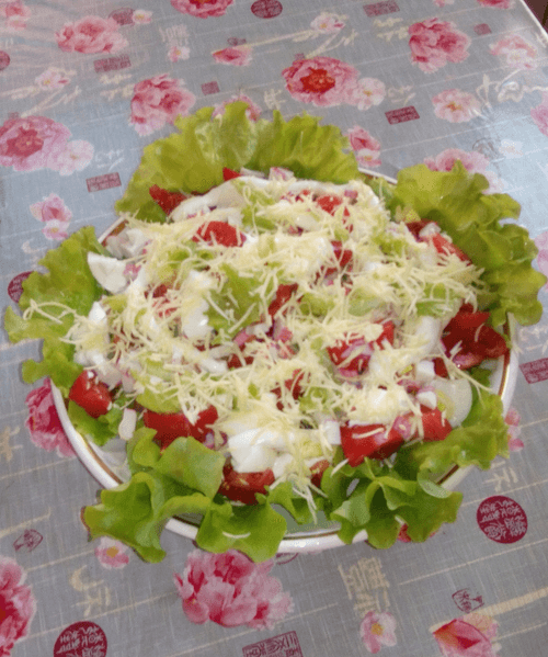 Then we place the remaining lettuce leaves in the salad bowl and start layering all the ingredients, adding greens and mayonnaise without mixing. We top it off with grated cheese.