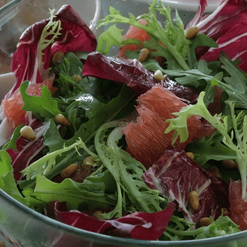 Green salad with grapefruit is a fresh and light dish filled with subtle aromas and an interesting combination of textures. The bright grapefruit adds a citrus tang that harmonizes with the soft bitterness of radicchio and the spiciness of arugula. Pine nuts add a pleasant crunch and nutty flavor, while the dressing made from grapefruit juice and olive oil makes the dish tender and refreshing. This salad is perfect for a light lunch or as an elegant appetizer before the main course.