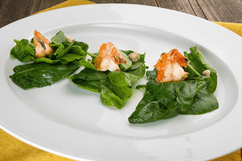 Place spinach leaves, shrimp, peas, and pieces of cheese on the plate.